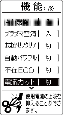 HOME 便利な機能 電流カット お買い上げ時の設定切使用電流の上限を抑えることができます。他の電気機器をよく使う時間帯など、ブレーカー落ちが心配なときなどに役立ちます。詳しい機能の働きを知りたい方はこちら設定のしかた を押すメニュー画面が表示されます。 で を選び を押す で「電流カット」を選び を押す で「大」または「小」を選び を押す大冷房・暖房運転時に使用電流の上限をおよそ1/2 下げた運転をします。小暖房運転時に使用電流の上限をおよそ1/4 下げた運転をします。切電流カットは働きません。詳しい機能の働き設定温度の範囲について電流カットを設定していても自動霜取り運転時(→ 自動霜取り運転)、外気温が高いとき(約 40℃以上)、加熱除菌運転中、または室外機が運転開始後約80 秒間は、使用電流の上限が高くなります。電流カットを設定すると、暖まり(冷え)が遅くなる場合や設定温度に到達しない場合があります。このときは、電流カットを「切」にしてください。電流カットを設定すると、次回運転時も同じ設定で運転をします。