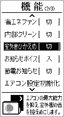 HOME 便利な機能 室外音ひかえめ お買い上げ時の設定切暖房時に運転能力を抑えることで、室外機の音を控えめにします。※ 停止中のみ設定を変更できます。詳しい機能の働きを知りたい方はこちら設定のしかた 停止中に を押すメニュー画面が表示されます。 で を選び を押す「室外音ひかえめ」を選び を押す でお好みの設定を選び を押す詳しい機能の働き室外音ひかえめについて室外音ひかえめ機能を「入」に設定したときは、最大能力を抑えるため、お部屋が暖まるまで時間がかかる場合があります。お部屋の温度が設定温度に近いときなどは、室外音ひかえめ機能を「入」に設定しても、運転音が下がらない場合があります。