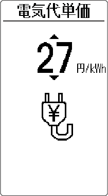 HOME 初期設定 電気代単価 お買い上げ時の設定27 円/kWh電気代の算出に用いる電気代単価を設定できます。※停止中のみ設定を変更できます。1 ~ 99 円 /kWhで設定できます。設定画面で を押すと1 円ずつ変わります。ご自宅の(電気代)契約単価は電力会社にお問い合わせください。操作のしかた 停止中に を押すメニュー画面が表示されます。 でお知らせ を選び を押す で「初期設定」を選び を押す で「電気代単価」を選び を押す でご自宅の単価に合わせ を押す