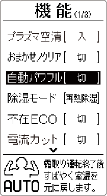 HOME 便利な機能 自動パワフル お買い上げ時の設定切暖房運転使用中に自動霜取り運転に入ったあと、お部屋の温度を設定温度にすばやく戻す機能です。※ 停止中のみ設定を変更できます。詳しい機能の働きを知りたい方はこちら設定のしかた 停止中に を押すメニュー画面が表示されます。 で を選び を押す で「自動パワフル」を選び を押す で「入」または「切」を選び を押す詳しい機能の働き自動霜取り運転(→ 自動霜取り運転)終了後、自動で風量を高めた運転を行います。リモコンの風量表示は変わりません。風量を高めた運転は、お部屋の温度が十分暖まった時点で、元の設定風量に戻ります。ただし、自動霜取り運転停止後約30 分間は風量を高めた運転をします。自動パワフルは、暖房運転および AI 自動運転で暖房が選択された場合のみ動作します。お部屋の温度と設定温度の差が大きい場合には、お部屋の温度を設定温度に近づけることを優先し、暖房能力が最大となる運転を自動で行います。