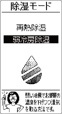 HOME 便利な機能 除湿モード 除湿モードを変更するお買い上げ時の設定再熱除湿※ 停止中のみ設定を変更できます。操作のしかた 停止中に を押すメニュー画面が表示されます。 で を選び を押す で「除湿モード」を選び を押す でお好みの除湿モードを選び を押す再熱除湿冷やして除湿した空気と暖めた空気を、エアコンの内部で混ぜて送風します。お部屋の温度の低下を防ぐため、湿気を取っても肌寒くなりにくい除湿方法です。弱冷房除湿弱い冷房で除湿する方法です。お部屋の温度はやや下がります。