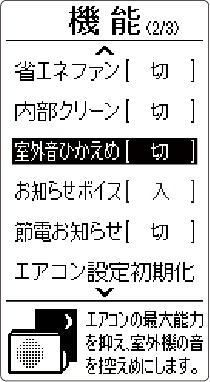HOME 便利な機能 室外音ひかえめ お買い上げ時の設定切暖房時に運転能力を抑えることで、室外機の音を控えめにします。※ 停止中のみ設定を変更できます。詳しい機能の働きを知りたい方はこちら設定のしかた 停止中に を押すメニュー画面が表示されます。 で を選び を押す で「室外音ひかえめ」を選び を押す でお好みの設定を選び を押す詳しい機能の働き室外音ひかえめ機能を「入」に設定したときは、最大能力を抑えるため、お部屋が暖まるまで時間がかかる場合があります。お部屋の温度が設定温度に近いときなどは、室外音ひかえめ機能を「入」に設定しても、運転音が下がらない場合があります。