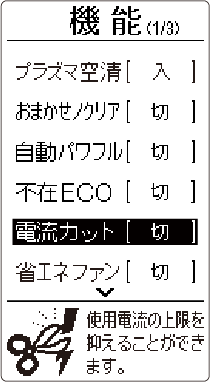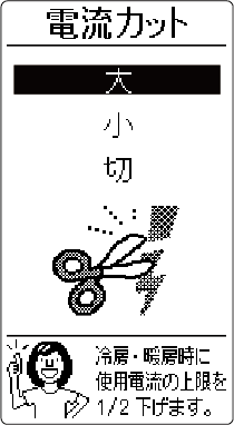 HOME 便利な機能 電流カット お買い上げ時の設定切使用電流の上限を抑えることができます。他の電気機器をよく使う時間帯など、ブレーカー落ちが心配なときなどに役立ちます。詳しい機能の働きを知りたい方はこちら設定のしかた を押すメニュー画面が表示されます。 で を選び を押す で「電流カット」を選び を押す で「大」または「小」を選び を押す大冷房・暖房運転時に使用電流の上限をおよそ1/2 下げた運転をします。小暖房運転時に使用電流の上限をおよそ1/4 下げた運転をします。切電流カットは働きません。詳しい機能の働き設定温度の範囲について電流カットを設定していても自動霜取り運転時(→ 自動霜取り運転)、外気温が高いとき(約 40℃以上)、加熱除菌運転中、または室外機が運転開始後約80 秒間は、使用電流の上限が高くなります。電流カットを設定すると、暖まり(冷え)が遅くなる場合や設定温度に到達しない場合があります。このときは、電流カットを「切」にしてください。電流カットを設定すると、次回運転時も同じ設定で運転をします。