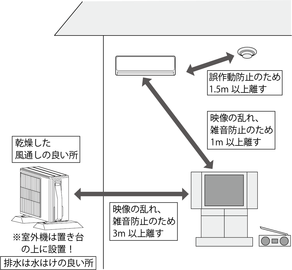 室内機およびリモコンは、テレビやラジオから1m 以上離してください。また、電源は必ずエアコン専用のコンセントをお使いください。