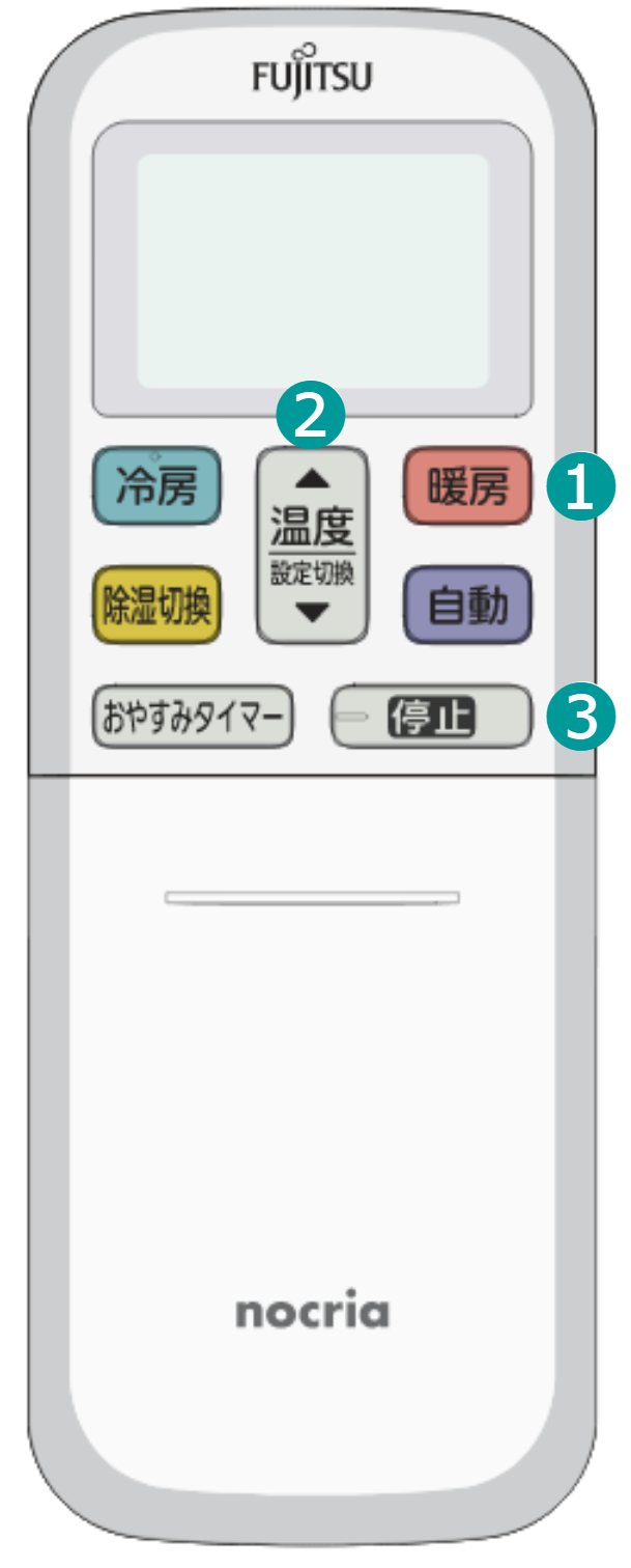 ホーム 基本の使いかた 暖房で運転する 詳しい機能の働きを知りたい方はこちら 操作のしかた を押して、運転を開始する本体の運転ランプ(緑)が点灯し、運転を開始します。▶本体表示部 を押して、温度を変える▶押すごとに 0.5℃ずつ変わります。▶次の場合は温度を変えることはできません。 送風運転中 みまもり機能で運転中 加熱除菌運転中 内部クリーン運転中 を押して、運転を停止する本体の運転ランプ(緑)が消灯し、運転を停止します。▶以下の機能を設定している場合は、停止後に機能が働くことがあります。※ 本体のクリーン/みまもりランプ(黄)が点灯します。 みまもり機能 内部クリーン ▶みまもり機能設定中は を押しても運転を停止しません。 詳しい機能の働き 設定温度の範囲について 設定できる温度の範囲冷房・除湿運転…18 ~ 30℃暖房運転……………16 ~ 30℃自動運転……………「標準温度」に対して2℃高め、2℃低めの範囲 おすすめの設定温度の目安冷房運転…26 ~ 28℃暖房運転…20 ~ 24℃ 使用できる外気温と湿度の範囲 冷房・除湿 外気温※ 1 約21 ~ 50℃お部屋の湿度※ 2 約80%以下 暖房 外気温※ 1 約-15℃~ 24℃ ※ 1:室外機の吸込み空気の温度※ 2:高い湿度の中で長時間運転すると、エアコンの表面に露が付き、水滴が落ちることがあります。 上記範囲より高い温度で運転すると、自動保護装置が働き、運転を停止することがあります。また、冷房・除湿運転の場合、上記範囲より低い温度で運転すると、熱交換器(アルミフィン)が凍り、水もれなど故障の原因になることがあります。 エアコンは、お部屋の冷房・暖房・除湿以外の目的にご使用にならないでください。 室外機に別売品を装着している場合の範囲については、別売品の取付説明書を合わせてご確認ください。 暖房運転について 設定温度をお部屋の温度より高くしないと、暖房運転になりません。 このエアコンは外気温が低下すると、能力が低下するのを防ぐ運転をしますが、それでも暖房能力が不足する場合には他の暖房器具との併用をおすすめします。 暖房運転を開始したとき、室内機の内部が暖まってから温風を吹き出すようにするため、約3 ~ 5分間はごく弱い風で運転し、その後設定した風量になります。 暖房運転開始から約 1 時間経過するまでは、お部屋をすばやく暖めるために、自動的にリモコンの設定温度より約2℃高めで運転します。1 時間経過すると、リモコンの設定どおりの温度に戻ります。 外気温が低いときに暖房運転を行うと、室外機に霜が付くため、自動的に霜取り運転を行います。霜取り運転中は本体の運転ランプ(緑)がおそい点滅をし、暖房運転を一時的に停止します。(→ 下記「自動霜取り運転について」参照) 自動霜取り運転について 外気温が低く、湿度が高いときに暖房運転を行うと、室外機に霜が付き、暖房能力が低下します。このようなときは、暖房運転を一時的に停止し、霜取り運転を行います。(室内・室外ファンが停止します。)元の運転に戻るまでに約4 ~ 15 分程度の時間がかかります。その間、本体の運転ランプ(緑)はおそい点滅をします。▶ 本体表示部<ホットキープ除霜> 霜取り運転が始まる前に、あらかじめお部屋の温度を上げておき、霜取り運転中のお部屋の温度の低下を緩和します。 <OFF 時除霜> 暖房運転を止めたときに室外機に霜が付いていると、自動的に霜取り運転を行います。このとき室内機の運転ランプ(緑)がおそい点滅をし、室外機だけが数分間運転したあとに止まります。次回の運転時には、霜なし状態でスタートできます。
