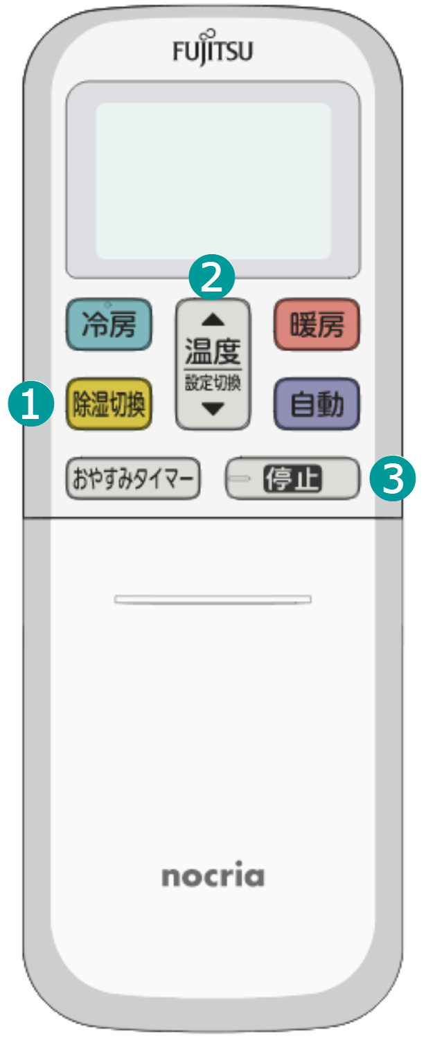 ホーム 基本の使いかた 除湿で運転する・除湿方法を切り替える 禁止 長時間冷風を身体に当てたり、冷やしすぎたりしない。体調悪化や健康障害の原因 詳しい機能の働きを知りたい方はこちら 操作のしかた を押して、運転を開始する本体の運転ランプ(緑)が点灯し、運転を開始します。▶本体表示部▶ を押すごとに、「除湿」(ソフトクール除湿)と「ひかえめ除湿」を切り換えることができます。 を押して、温度を変える▶押すごとに 0.5℃ずつ変わります。▶次の場合は温度を変えることはできません。 送風運転中 みまもり機能で運転中 加熱除菌運転中 内部クリーン運転中 を押して、運転を停止する本体の運転ランプ(緑)が消灯し、運転を停止します。▶以下の機能を設定している場合は、停止後に機能が働くことがあります。※ 本体のクリーン/みまもりランプ(黄)が点灯します。 みまもり機能 内部クリーン ▶みまもり機能設定中は を押しても運転を停止しません。 詳しい機能の働き 設定温度の範囲について 設定できる温度の範囲冷房・除湿運転…18 ~ 30℃暖房運転……………16 ~ 30℃自動運転……………「標準温度」に対して2℃高め、2℃低めの範囲 おすすめの設定温度の目安冷房運転…26 ~ 28℃暖房運転…20 ~ 24℃ 使用できる外気温と湿度の範囲 冷房・除湿 外気温※ 1 約21 ~ 50℃お部屋の湿度※ 2 約80%以下 暖房 外気温※ 1 約-15℃~ 24℃ ※ 1:室外機の吸込み空気の温度※ 2:高い湿度の中で長時間運転すると、エアコンの表面に露が付き、水滴が落ちることがあります。 上記範囲より高い温度で運転すると、自動保護装置が働き、運転を停止することがあります。また、冷房・除湿運転の場合、上記範囲より低い温度で運転すると、熱交換器(アルミフィン)が凍り、水もれなど故障の原因になることがあります。 エアコンは、お部屋の冷房・暖房・除湿以外の目的にご使用にならないでください。 室外機に別売品を装着している場合の範囲については、別売品の取付説明書を合わせてご確認ください。 除湿について 弱い冷房で除湿します。お部屋の温度をあまり下げずに除湿したいときにお使いください。 除湿優先運転となりますので、お部屋の温度があまり下がらないことがあります。また、除湿運転でお部屋を暖めることはできません。 除湿運転中は弱い風で運転し、お部屋の湿度調整のために室内ファンがときどき停止します。 設定温度をお部屋の温度より低くしないと、除湿運転になりません。 除湿運転には通常の「除湿(ソフトクール除湿)」と「ひかえめ除湿」の 2種類があります。お好みに合わせて、運転内容を変更することができます。お買い上げ時は、通常の「除湿(ソフトクール除湿)」になっています。<ひかえめ除湿>お部屋の温度が設定温度に近づくと、通常の除湿よりも冷えを抑えながら除湿を行います。(通常の除湿よりも除湿量は少なくなります。)