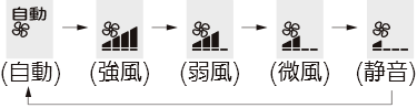 ホーム 基本の使いかた 風の強さを変える 詳しい機能の働きを知りたい方はこちら 操作のしかた リモコンカバーを開ける 運転中に を押してお好みの風量を選ぶ を押すごとに、次のように風量が変わります。 リモコン表示部に、設定した風量が表示されます。 詳しい機能の働き 風量について 除湿運転中、みまもり機能で運転中は、風量の変更はできません。 暖房運転中、吹き出し温度が低いときは風量を弱めます。 自動運転開始時に風量を変更したときは、エアコンが運転の種類を選んだあとに風量が変更されます。 自動運転で除湿・監視運転(送風)が選ばれたときは、 を押すと風量設定画面が表示されますが、風量は変更されません。 <風量自動について> 設定温度とお部屋の温度の差が大きいと強めの風で運転し、差が小さくなると徐々に弱めの風で運転します。 送風運転中は、弱風で運転します。