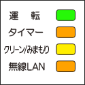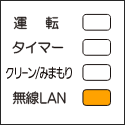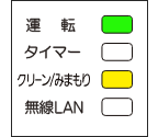 運転ランプ(緑)がおそい点滅(0.5秒点灯/2.5秒消灯)、タイマーランプ(橙)とクリーン/みまもりランプ(黄)と無線LANランプ(橙)が点灯 |