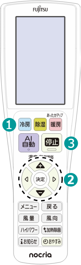 ホーム 基本の使いかた(ボタン機能) 冷房で運転する 禁止 長時間冷風を身体に当てたり、冷やしすぎたりしない。体調悪化や健康障害の原因 詳しい機能の働きを知りたい方はこちら 操作のしかた を押して、運転を開始する本体の運転ランプ(緑)が点灯し、運転を開始します。▶本体表示部 で温度を変える▶押すごとに 0.5℃ずつ変わります。▶次の場合は温度を変えることはできません。 送風運転中 ランドリー運転中 みまもり機能で運転中 加熱除菌運転中 内部クリーン運転中 で運転を停止する本体の運転ランプ(緑)が消灯し、運転を停止します。▶以下の機能を設定している場合は、停止後に機能が働くことがあります。※ お知らせランプ(黄)またはクリーンランプ(黄)が点灯します。 みまもり機能 内部クリーン フィルターおそうじ ▶みまもり機能設定中は を押しても運転を停止しません。 詳しい機能の働き 設定温度の範囲について 設定できる温度の範囲冷房運転…18 ~ 30℃暖房運転…16 ~ 30℃ おすすめの設定温度の目安冷房運転…26 ~ 28℃暖房運転…20 ~ 24℃ 使用できる外気温と湿度の範囲 冷房・除湿(弱冷房) 外気温※ 1 約21 ~ 50℃お部屋の湿度※ 2 約80%以下 除湿(再熱) 外気温※ 1 約1~43℃ 暖房 外気温※ 1 約-25℃~ 24℃ ランドリー 外気温※ 1 約1℃以上お部屋の湿度※ 2 約80%以下 ※ 1:室外機の吸込み空気の温度※ 2:高い湿度の中で長時間運転すると、エアコンの表面に露が付き、水滴が落ちることがあります。 上記範囲より高い温度で運転すると、自動保護装置が働き、運転を停止することがあります。また、冷房・除湿・ランドリー運転の場合、上記範囲より低い温度で運転すると、熱交換器(アルミフィン)が凍り、水もれなど故障の原因になることがあります。 エアコンは、お部屋の冷房・暖房・除湿以外の目的にご使用にならないでください。 室外機に別売品を装着している場合の範囲については、別売品の取付説明書を合わせてご確認ください。 冷房運転について 設定温度をお部屋の温度より低くしないと、冷房運転になりません。