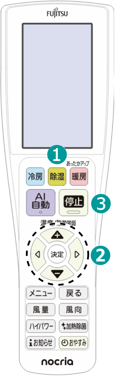 ホーム 基本の使いかた(ボタン機能) 除湿で運転する 禁止 長時間冷風を身体に当てたり、冷やしすぎたりしない。体調悪化や健康障害の原因 詳しい機能の働きを知りたい方はこちら 操作のしかた を押して、運転を開始する本体の運転ランプ(緑)が点灯し、運転を開始します。▶本体表示部 で除湿設定の強さを変える で運転を停止する本体の運転ランプ(緑)が消灯し、運転を停止します。▶以下の機能を設定している場合は、停止後に機能が働くことがあります。※ お知らせランプ(黄)またはクリーンランプ(黄)が点灯します。 みまもり機能 内部クリーン フィルターおそうじ ▶みまもり機能設定中は を押しても運転を停止しません。 詳しい機能の働き 使用できる外気温と湿度の範囲 冷房・除湿(弱冷房) 外気温※ 1 約21 ~ 50℃お部屋の湿度※ 2 約80%以下 除湿(再熱) 外気温※ 1 約1~43℃ 暖房 外気温※ 1 約-25℃~ 24℃ ランドリー 外気温※ 1 約1℃以上お部屋の湿度※ 2 約80%以下 ※ 1:室外機の吸込み空気の温度※ 2:高い湿度の中で長時間運転すると、エアコンの表面に露が付き、水滴が落ちることがあります。 上記範囲より高い温度で運転すると、自動保護装置が働き、運転を停止することがあります。また、冷房・除湿・ランドリー運転の場合、上記範囲より低い温度で運転すると、熱交換器(アルミフィン)が凍り、水もれなど故障の原因になることがあります。 エアコンは、お部屋の冷房・暖房・除湿以外の目的にご使用にならないでください。 室外機に別売品を装着している場合の範囲については、別売品の取付説明書を合わせてご確認ください。 除湿について 除湿運転には「再熱除湿」と「弱冷房除湿(ソフトクール除湿)」の2 種類があります。お好みに合わせて、運転内容を変更することができます。(→ 除湿モード )<再熱除湿について> 運転を開始したときの外気温により、次のように運転を行います。 外気温が高いとき 除湿設定の強弱とお部屋の温度に合わせて、冷房と除湿を切り換えて運転します。お部屋の温度が低い場合、運転しないことがあります。 外気温が低いとき 除湿設定の強弱とお部屋の温度に合わせて、暖房と除湿を切り換えて運転します。 外気温が低いときに暖房に切り換わると、室外機に霜が付いて暖房能力が低下するため、運転を継続しながら霜取り運転を行います。(吹き出し温度が低いときは風量を弱めます。) Z225S、Z255S は、運転を一時的に停止し、霜取り運転を行います。運転を継続しながら霜取り運転は行いません。 霜の量が多いときは本体の運転ランプ(緑)がおそい点滅をし、除湿(再熱)運転を一時的に停止します。(→下記「自動霜取り運転について」参照) 除湿運転を始めたときや止めたときに除湿用の弁が切り換わる際、室外機の運転が5 分程度止まることがあります。これはエアコンが故障するのを防ぐためです。 お部屋の温度が高くなると、自動で弱冷房除湿に切り換えて運転します。 自動霜取り運転について 外気温が低く、湿度が高いときに暖房・除湿(再熱)・ランドリー運転を行うと、室外機に霜が付き、暖房能力が低下します。自動霜取り運転は、この霜を取るために行います。<バイパス暖房> 霜の量が少ない間に、約 2 分間、運転を継続しながら霜取り運転を行います。 Z225S、Z255S は、運転を一時的に停止し、霜取り運転を行います。運転を継続しながら霜取り運転は行いません。 霜の量が多いときは、暖房・除湿(再熱)・ランドリー運転を一時的に停止し霜取り運転を行います。(室内・室外ファンが停止します。)この場合、元の運転に戻るまで4 ~ 15分程度の時間がかかります。その間、本体の運転ランプ(緑)はおそい点滅をします。運転ランプ(緑):点滅 <ホットキープ除霜> 霜取り運転が始まる前に、あらかじめお部屋の温度を上げておき、霜取り運転中のお部屋の温度の低下を緩和します。 <OFF 時除霜> 暖房・除湿(再熱)・ランドリー運転を止めたときに室外機に霜が付いていると、自動的に霜取り運転を行います。このとき室内機の運転ランプ(緑)がおそい点滅をし、室外機だけが数分間運転したあとに止まります。次回の運転時には、霜なし状態でスタートできます。
