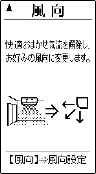 快適おまかせ気流設定中は、下記の画面が表示されます。 もう一度 を押すと、快適おまかせ気流が解除され、風向選択画面が表示されます。