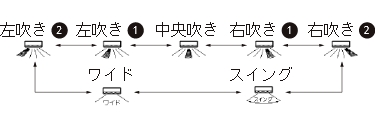 - 独立した左右風向板を、左吹き❷と右吹き❷の風向にし、広範囲に風を送ります。