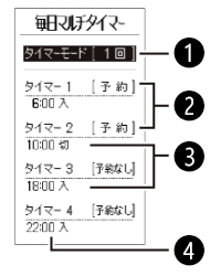❶タイマーモードの種類 毎日:毎日くり返し 1回:1回のみ ❷タイマーの予約状況 ❸タイマーの種類 入:入タイマー 切:切タイマー ❹タイマーの設定時刻 |