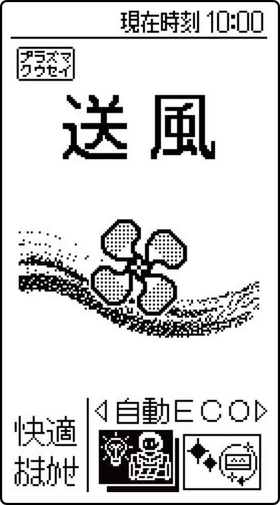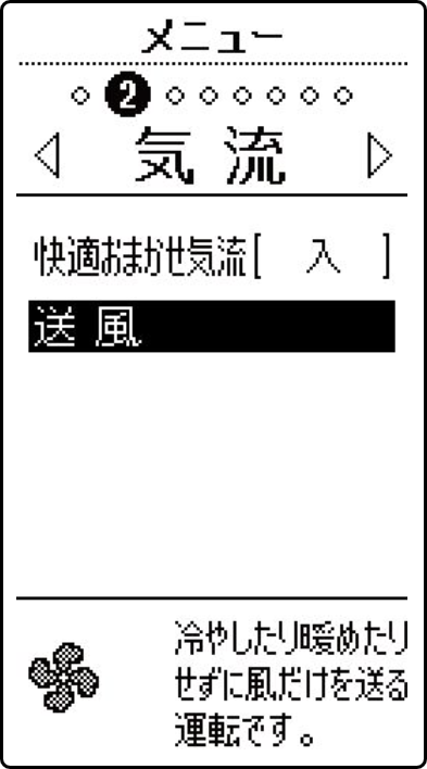 ホーム メニュー機能❷気流 送風 詳しい機能の働きを知りたい方はこちら 操作のしかた を押すメニュー画面が表示されます。 で「❷気流」を選ぶ で「送風」を選び を押す本体の運転ランプ(緑)が点灯し、送風運転が開始されます。▶本体表示部 で運転を停止する本体の運転ランプ(緑)が消灯し、運転を停止します。▶以下の機能を設定している場合は、停止後に機能が働くことがあります。※ お知らせランプ(黄)またはクリーンランプ(黄)が点灯します。 みまもり機能 内部クリーン フィルターおそうじ ▶みまもり機能設定中は を押しても運転を停止しません。 詳しい機能の働き 送風運転について お部屋の空気を循環させたいときや、風に当たりたいときなどにお使いください。 サーキュレーターと同様にお部屋の中の空気を循環させることができます。 風が遠くまで届くので、お部屋の空気の温度ムラを効率よく解消させることができます。 窓を開けて送風運転をすると、室内にこもっている熱気を逃がすなど、換気にもご利用いただけます。 吹出し方向を変えることができるので、扇風機のように風に当たることもできます。