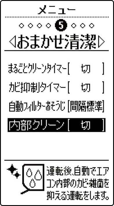 内部クリーンは、冷房・除湿運転停止後に自動で送風運転を行い、室内機内部(熱交換器、送風ファン、送風路)を乾燥させて、カビ菌や細菌を繁殖しにくくします。