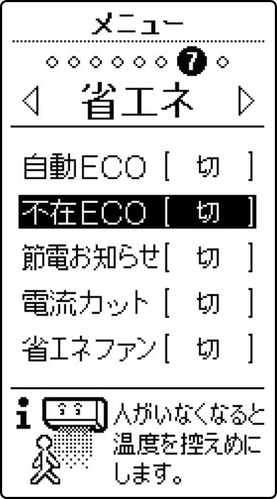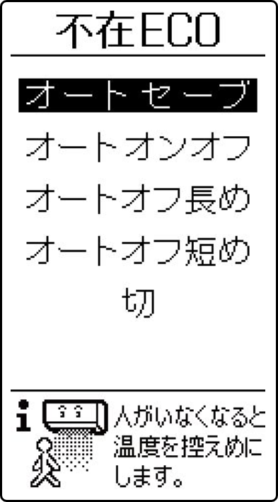 ▶ 不在ECOが働く設定は、一度設定すると、「切」に設定するまで有効です。