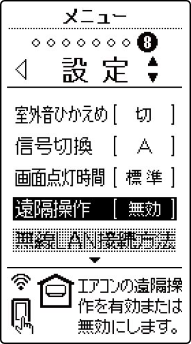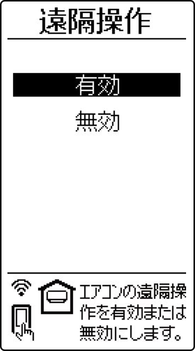 ホーム メニュー機能❽設定 遠隔操作 遠隔操作の有効 / 無効を切り替える お買い上げ時の設定 無効 を押すメニュー画面が表示されます。 で「❽設定」を選ぶ で「遠隔操作」を選び を押す で「有効」を選び を押す