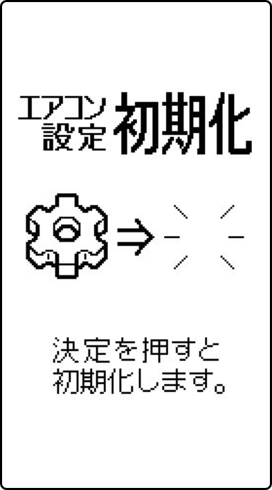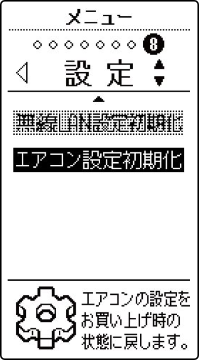 ホーム メニュー機能❽設定 エアコン設定初期化 エアコンとリモコンの設定を初期化して、お買い上げ時の状態に戻します。 ※ 停止中のみ設定を変更できます。 設定のしかた を押すメニュー画面が表示されます。 で「❽設定」を選ぶ で「エアコン設定初期化」を選び を押す を押す