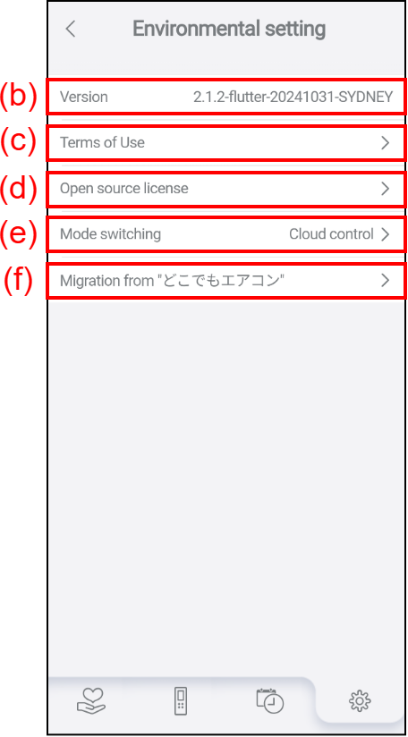 | (f) | Migration from "どこでもエアコン" | When this button is tapped, the Migration from "どこでもエアコン” screen will open, where you can switch the air conditioner control application from “どこでもエアコン” to the nocria app. (For more information, refer to "Migration from "どこでもエアコン".") |