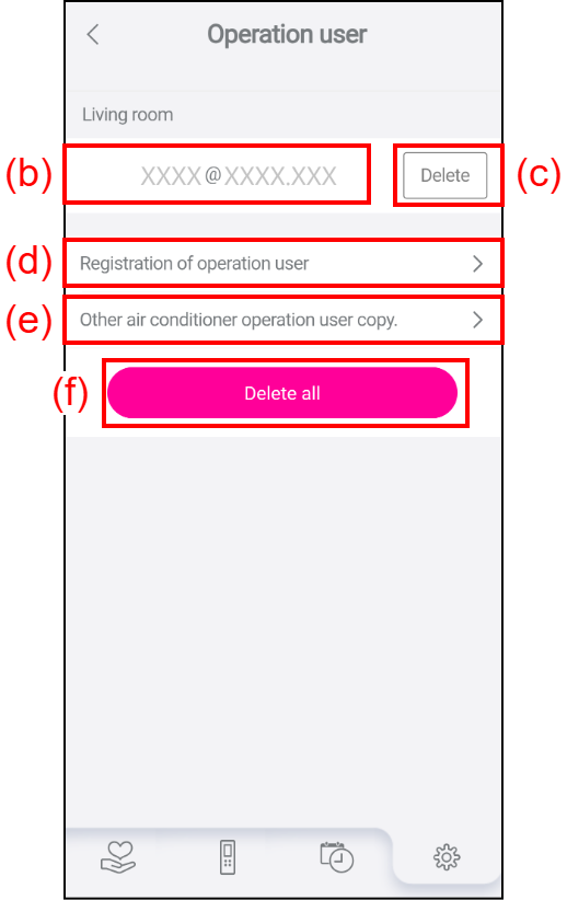 | (e) | Tap the area to copy the operation user from a different air conditioner in which the operation user is already registered. For details, refer to the following: "Copying an operation user of another air conditioner." |