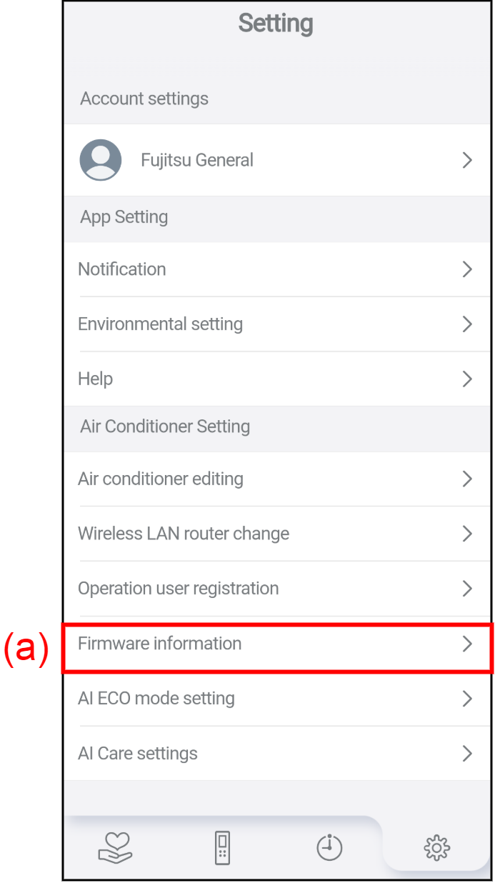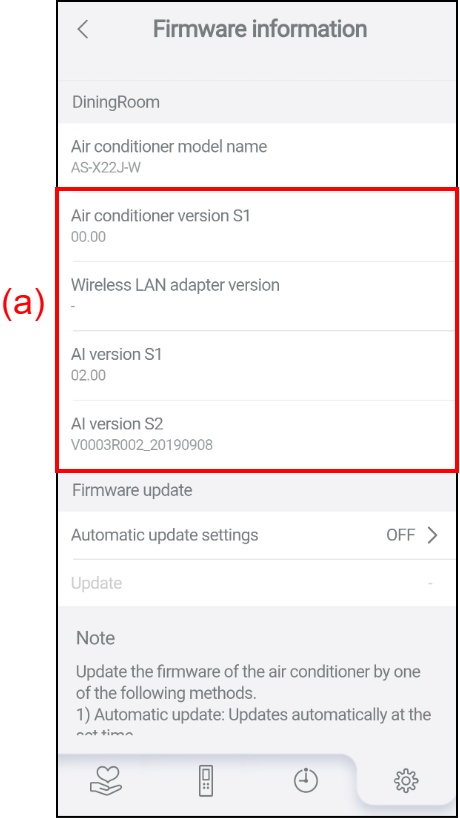 The firmware information of the wireless LAN adapter and air conditioner unit can be checked.