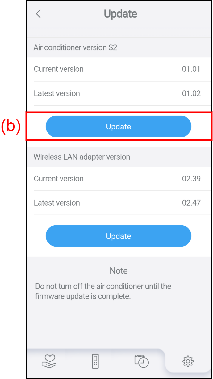 - Do not turn off the air conditioner power or close the application until the firmware update is completed.
