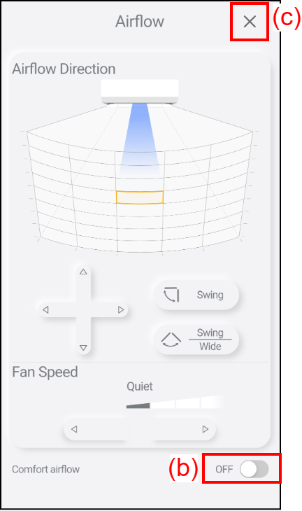 When the following screen is displayed, tap (b) to set Comfort airflow to “ON” or “OFF.”