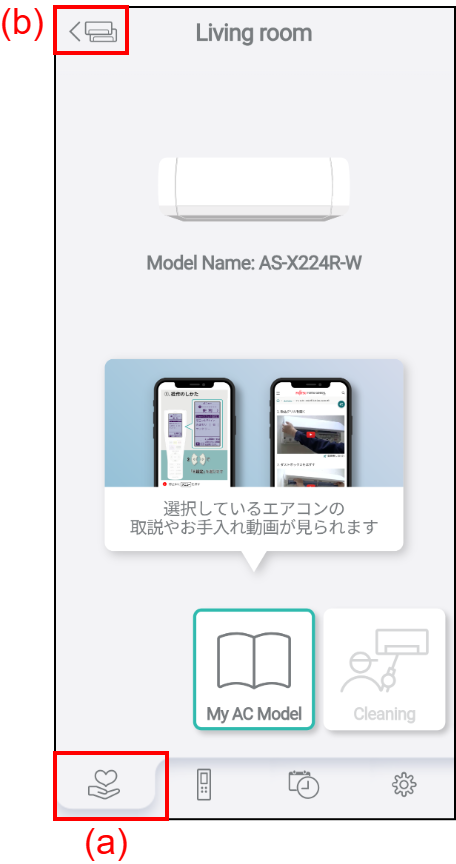 To switch the air conditioner for checking support information, tap (b), and then select the air conditioner from the Air conditioner list screen.