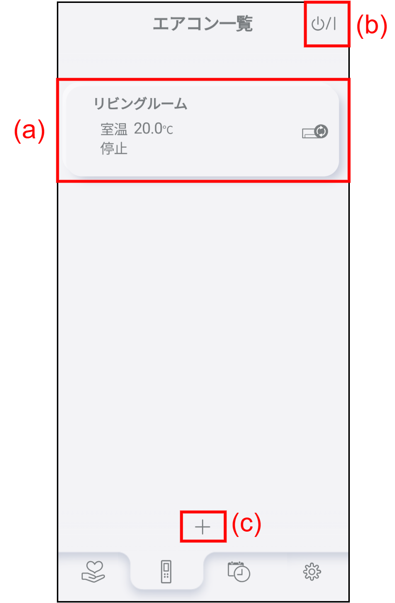 (c) をタップすると、新しいエアコンを登録できます。詳しくは、「エアコン登録」をご覧ください。