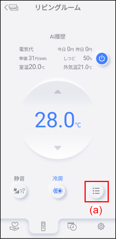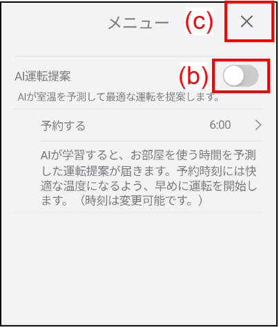 ホーム エアコンを操作する 操作画面 メニュー エアコンの操作画面から各種機能の設定ができます。 (a) をタッチしてメニュー画面を開きます。 各機能の (b) 部分をタッチして有効と無効を切り替えます。 有効 無効 (c) をタッチしてメニュー画面を閉じます。 <設定できる機能> AI運転提案 加湿(加湿器連動) お知らせ エアコンによっては、一部の機能が表示されない場合があります。