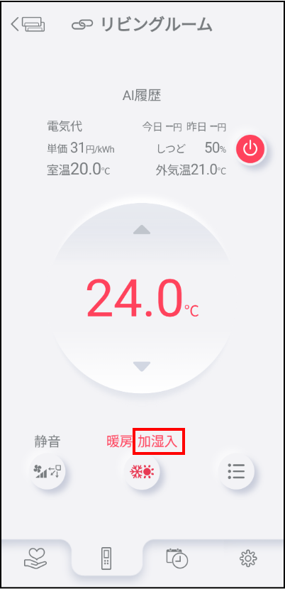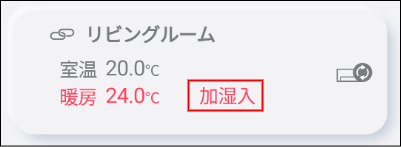 加湿器が運転しているときは、エアコン一覧画面、操作画面に表示される運転モードに「加湿入」と表示されます。