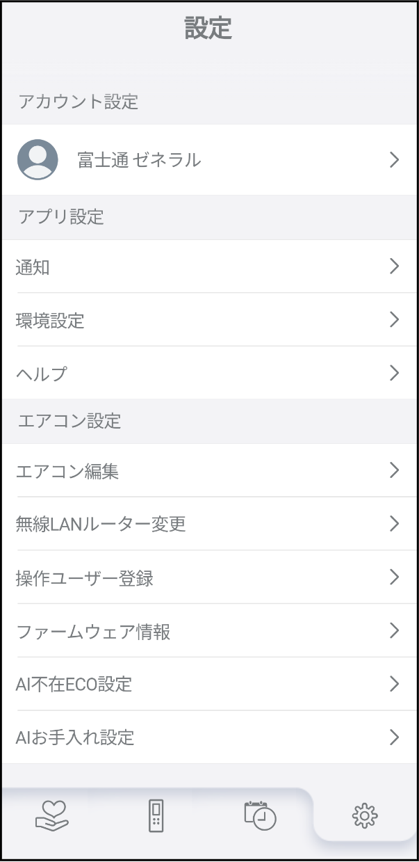 ホーム 各種設定を変更する 設定タブ [ ] から各種設定を変更・確認できます。 (a) をタップして設定タブを開きます。 以下の設定を確認、変更できます。 アカウント設定 アプリ設定 通知 環境設定 ヘルプ エアコン設定 エアコン編集 無線LANルーター変更 操作ユーザー登録 ファームウェア情報 AI不在ECO設定 AIお手入れ設定 お知らせ エアコンによっては、一部の機能が表示されない場合があります。
