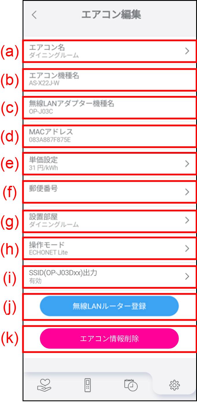 (郵便番号はAI機能搭載エアコンで地域の気象情報などを活用するために使用します。郵便番号が変わった場合は設定を変更してください。)(g) 設置部屋 タップするとエアコンを設置しているお部屋を設定できます。 (h) 操作モード※3 タップするとエアコンをスマートフォンから操作するか、HEMS機器から操作するか設定を変更できます。(詳しくは、「ECHONET Liteモード」をご覧ください。) (i) SSID(OP-J03Dxx)出力※4 無線LANアダプターが出力する無線LAN(APモード)のSSID(OP-J03Dxx)の出力を有効または無効に設定できます。(無線LANアダプターの更新が必要な場合は、画面に従って操作してください。) (j) 無線LANルーター登録※5 タップするとエアコンと無線LANルーターとの接続を開始します。接続が完了すると「ノクリアアプリ」がクラウド接続モードになります。(無線LANルーターの接続情報がすでに登録されている場合は接続しません。)