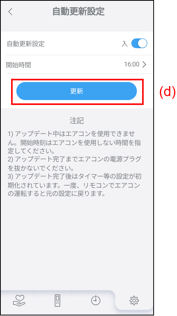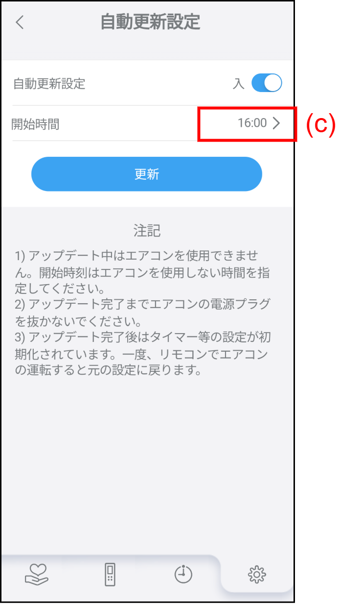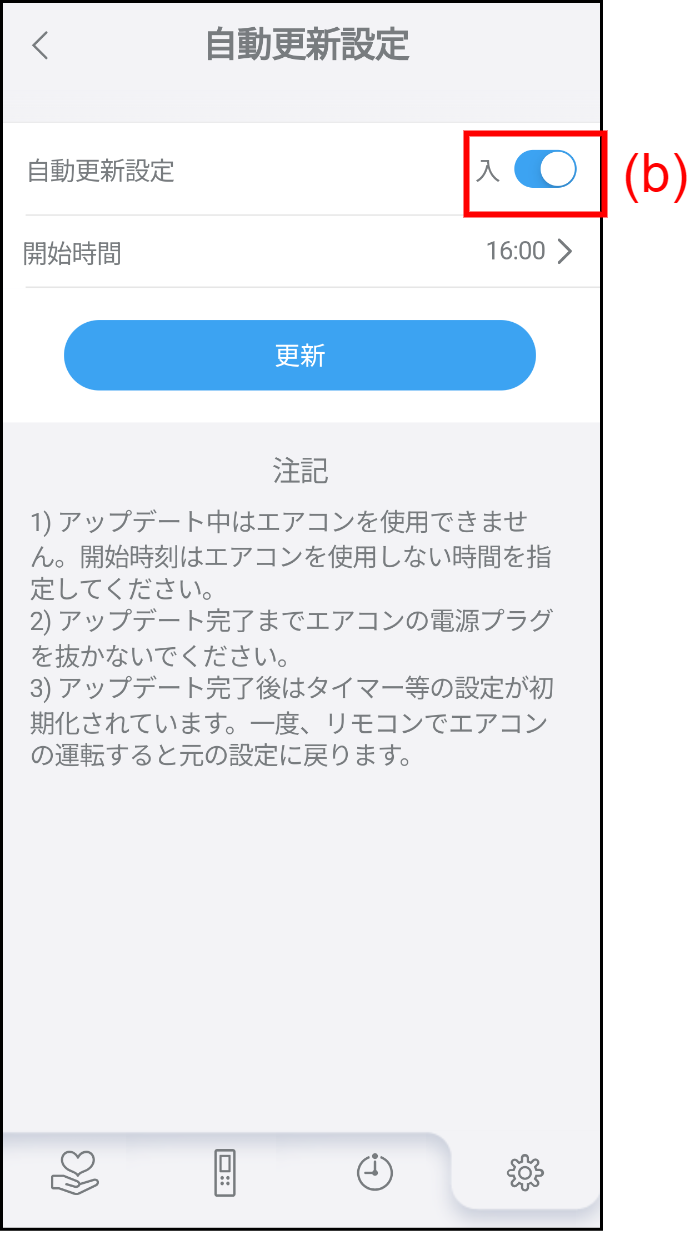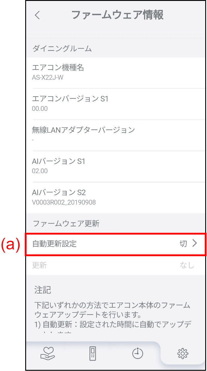 エアコンの機種によっては、自動更新設定を「入」にすると、注記画面が表示されます。
