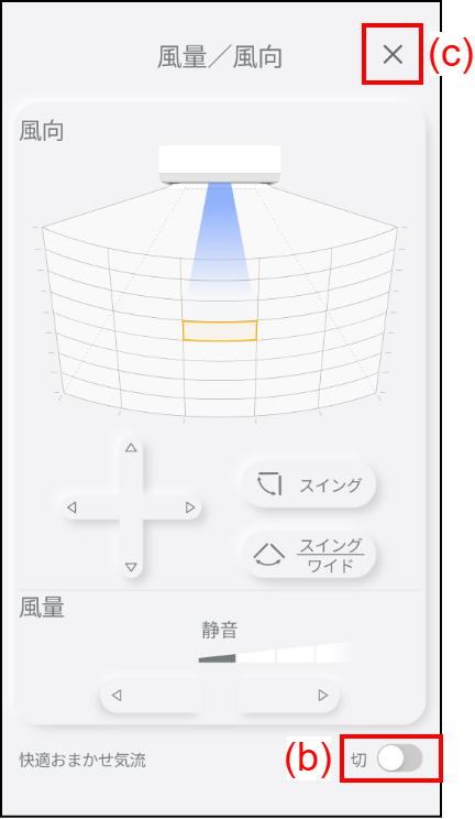 (c) をタップすると風量 / 風向画面が閉じます。