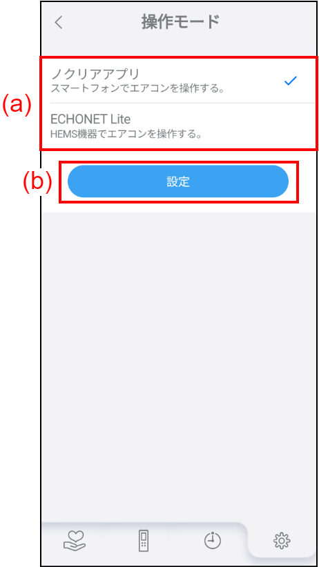- 設定したい操作モード (a) をタップして選択し、[設定] (b) をタップします。設定がエアコンに送信されます。