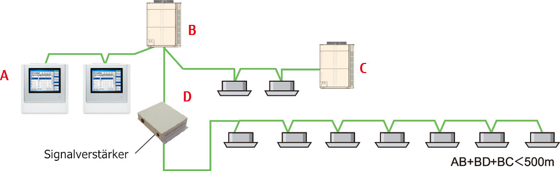- Bis zu 8 Signalverstärker können im VRF Netzwerksystem installiert werden.