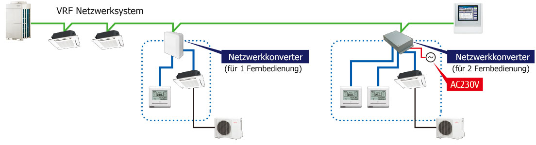 - Beim Anschluss eines Single Split Systems an ein VRF Netzwerksystem ist ein Netzwerkkonverter erforderlich.