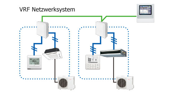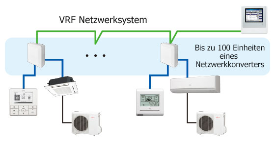Single Split Systeme können zentral gesteuert werden. (Bis zu 100 Einheiten eines Netzwerkkonverters können an ein VRF Netzwerksystem angeschlossen werden)