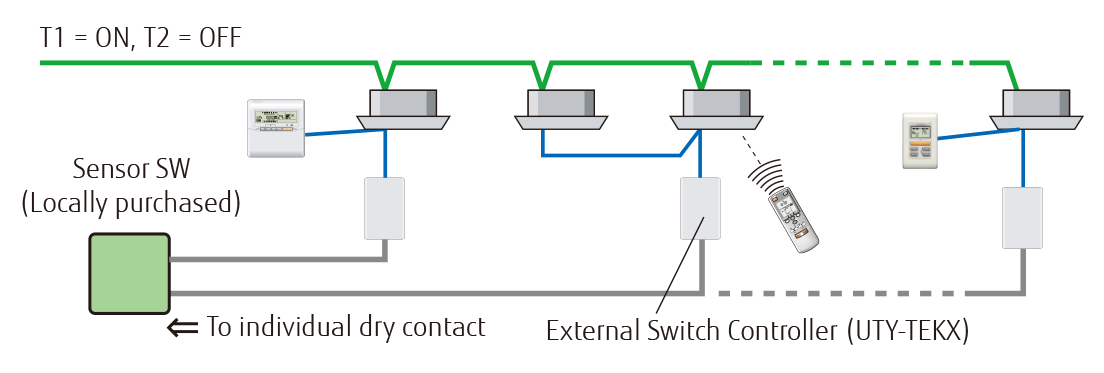 - Yhdessä kaupallisesti saatavan avainkorttikytkimen tai muiden anturien kanssa tämä ulkoinen kytkinohjain mahdollistaa yhdistettyjen ilmastointilaitteiden virran kytkennän/poiskytkennän, huoneenlämpötilan ja puhaltimen nopeuden hallinnan sekä pääohjauksen. Tämä tekee tuotteesta erinomaisen ratkaisun hotellihuoneisiin.