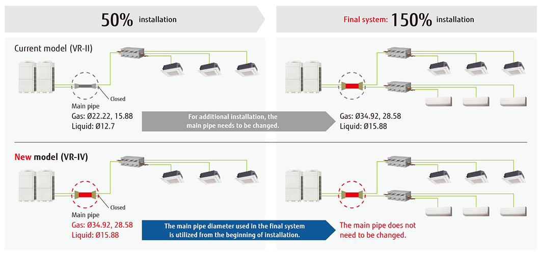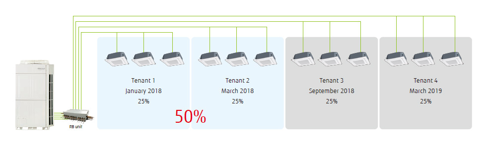 Tämä toiminto on erityisen hyödyllinen, kun osittainen ilmastointi käynnistetään rakenteilla olevassa rakennuksessa. Asennustyö voidaan lisätä joustavasti kullekin vuokralaiselle.