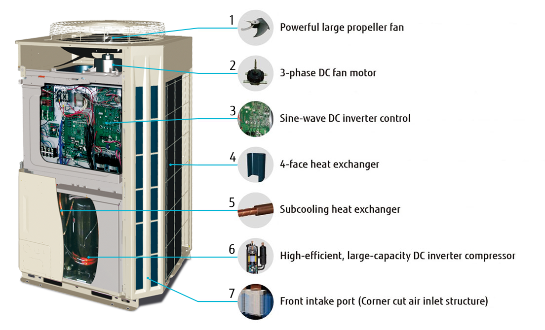 Ulkoyksikön lämmönvaihdin on jaettu ylä- ja alaosaan. Lämmönvaihtimen tehokkuutta on parannettu käyttämällä optimaalista kylmäaineen reitin ohjausta, jossa kylmäainetta jaetaan enemmän ylälämmönvaihtimeen, sillä siellä on tehokkaampi ilmanotto.