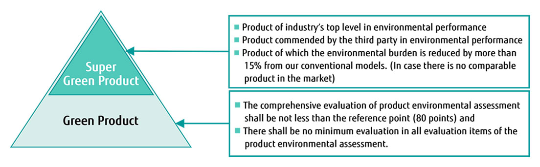 A product with a total environmental assessment score of more than the standard score (80 points) and a product that does not have a minimum rating for all evaluation items is defined as a "Green Product". And among them, the products which have the top level(Note1) of environmental performance are designated as "Super Green Product".