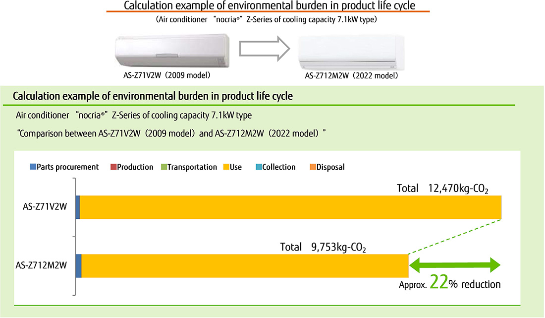 As a result of our efforts to improve the energy efficiency of newly developed products, CO2 emissions from air conditioners developed and sold in FY2022 during product use were reduced by 22.6% compared with FY2013. We will continue to develop products with even greater energy efficiency to contribute to the reduction of greenhouse gas emissions.