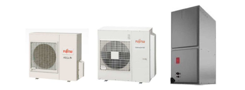 (From left to right) 2- and 2.5-ton capacity side-blowing compact outdoor unit with a single fan; 3- and 4-ton capacity outdoor unit of the same configuration; and a 3- and 4-ton capacity multi-positional air-handling indoor unit