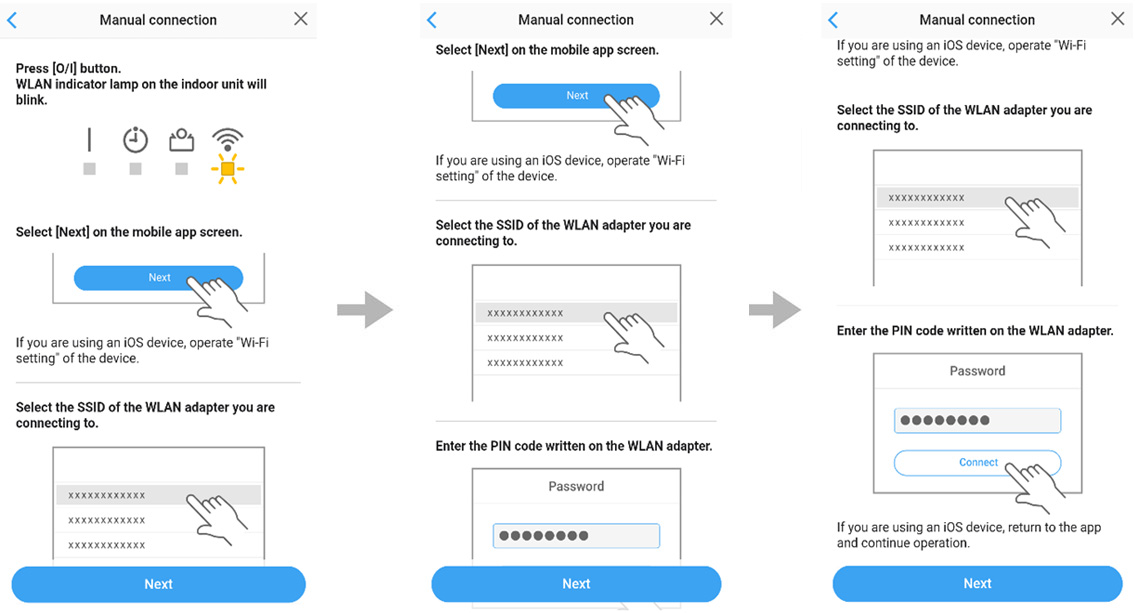 For iOS, it is necessary to select the SSID of the adapter on the device's Wi-Fi setting screen.
