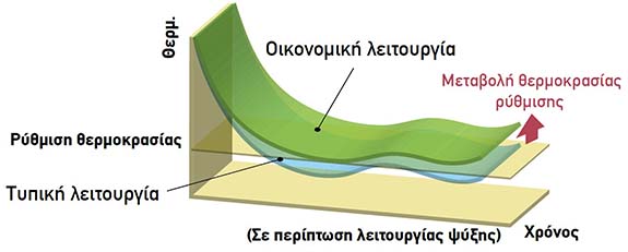 Η καθορισμένη θερμοκρασία αυξάνεται αυτόματα (κατά τη διάρκεια της λειτουργίας ψύξης) ή μειώνεται (κατά τη διάρκεια της λειτουργίας θέρμανσης) κατά 1 °C για εξοικονόμηση ενέργειας.