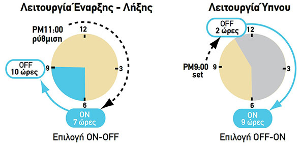 Μπορείτε να ρυθμίσετε τους χρόνους ενεργοποίησης/απενεργοποίησης ή απενεργοποίησης/ενεργοποίησης ανάλογα με τις ανάγκες του τρόπου ζωής σας. (Επιλέξιμα χρονικά διαστήματα: 0,5, 1, 1,5, 2, 2,5, ----- 9,5, 10, 11, 12 ώρες)