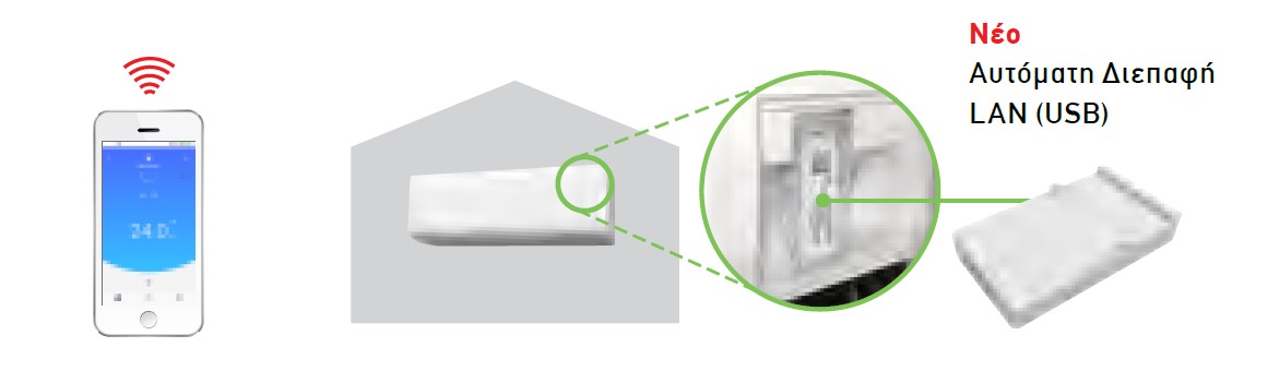Με έναν προαιρετικό προσαρμογέα ασύρματου LAN εγκατεστημένο στο κλιματιστικό, μπορείτε να ελέγχετε το κλιματιστικό από οπουδήποτε με την έξυπνη συσκευή σας. Η εγκατάσταση του προσαρμογέα δεν απαιτεί καμία τεχνική εργασία.