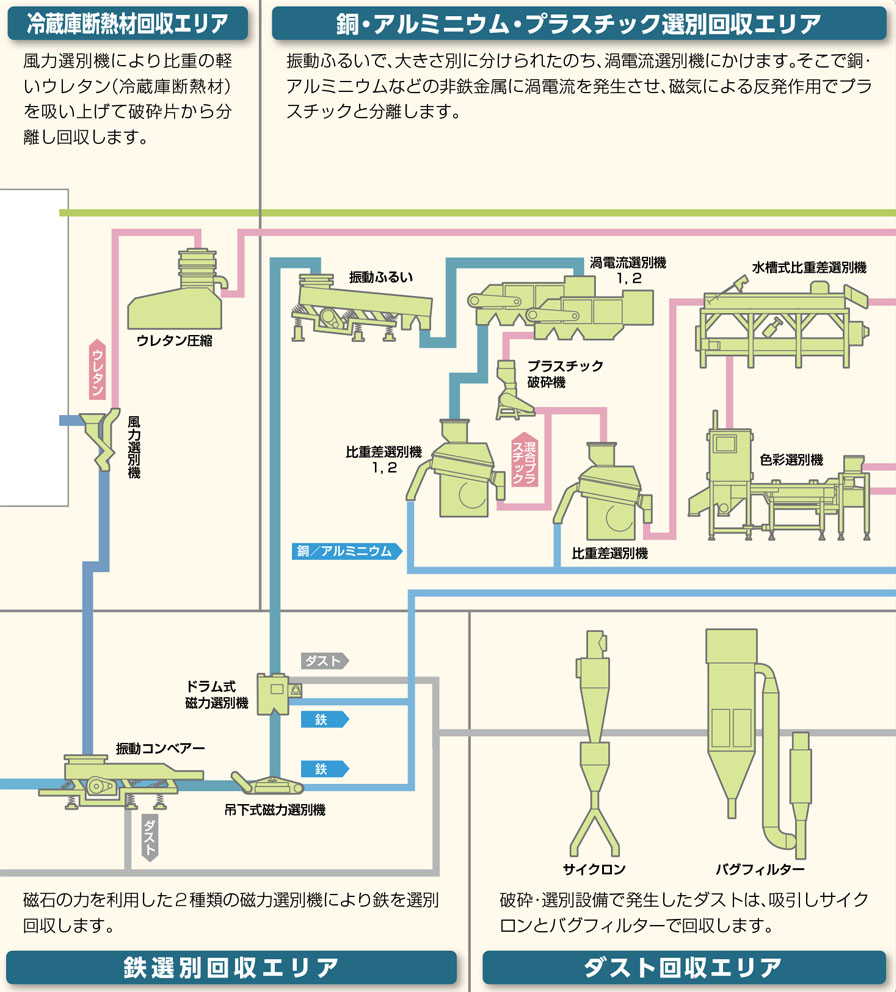 風力選別機により比重の軽いウレタン(冷蔵庫断熱材)を吸い上げて破砕片から分離し回収します。
